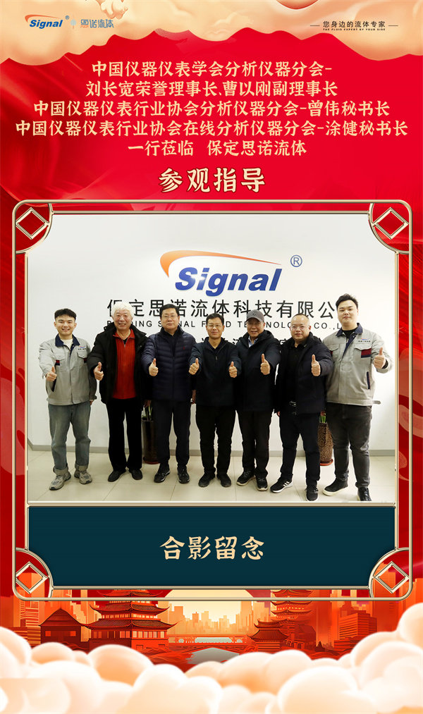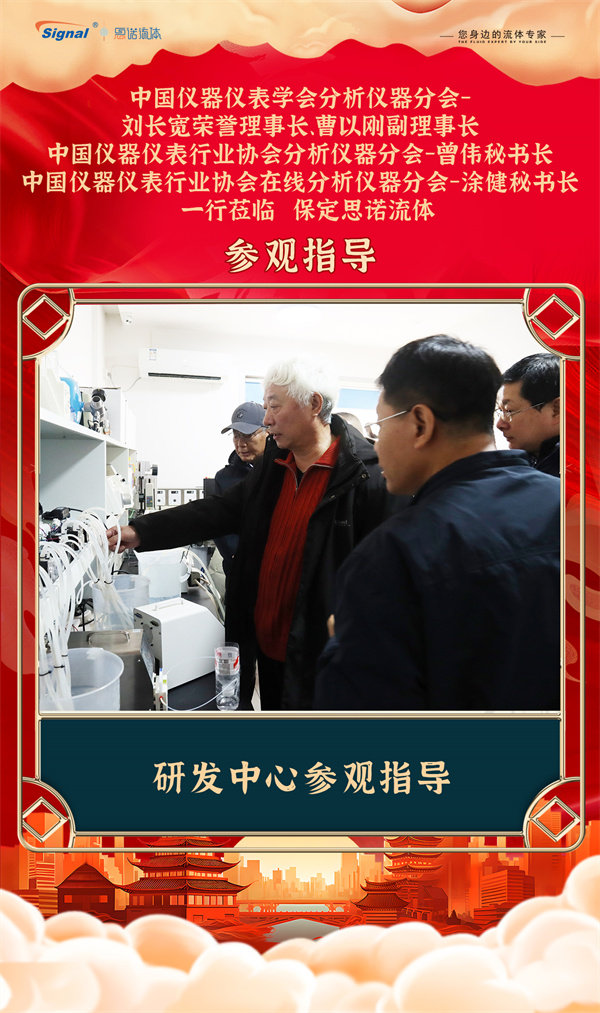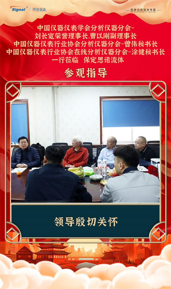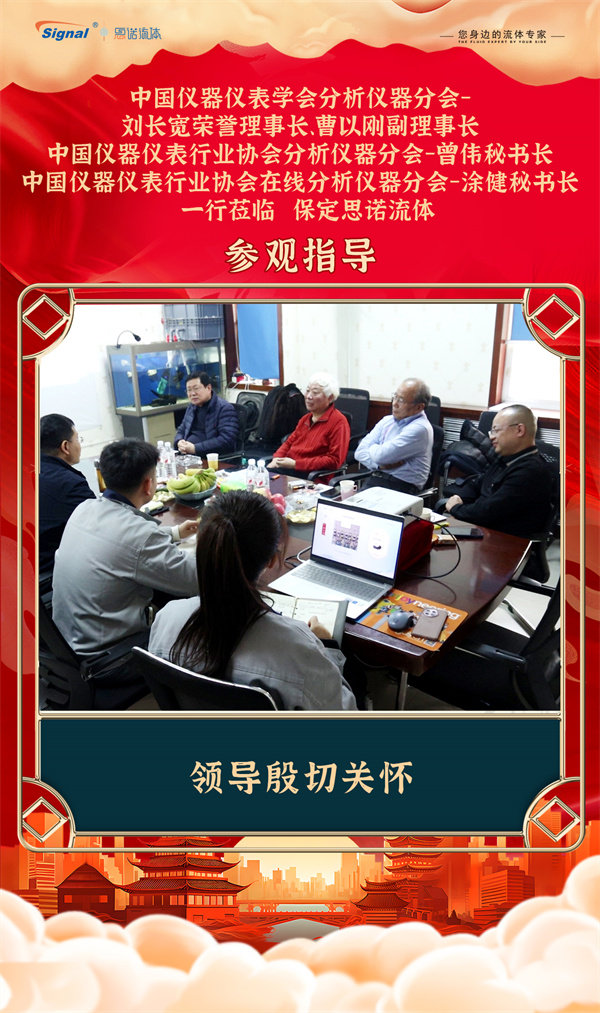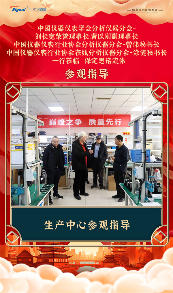 寒冬不寒,情暖人心!2025年12月19日,中國儀器儀表學會分析儀器分會-劉長寬榮譽理事長、曹以剛副理事長、中國儀器儀表行業協會分析儀器分會-曾偉秘書長、中國儀器儀表行業協會在線分析儀器分會-涂健秘書長一行蒞臨保定思諾流體參觀指導!公司管理層及相關部門負責人對貴賓的到來表示熱烈歡迎,并全程陪同交流參觀。